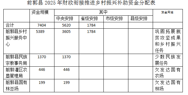 現(xiàn)將前郭縣2025年財(cái)政銜接推進(jìn)鄉(xiāng)村振興補(bǔ)助資金分配情況予以公示,公示期為10天(2025年6月30日至7月11日)。如對(duì)結(jié)果有異議,請(qǐng)?jiān)诠酒趦?nèi)對(duì)以下部門提出意見(jiàn)。