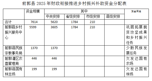 現(xiàn)將前郭縣2025年財政銜接推進鄉(xiāng)村振興補助資金分配情況予以公示,公示期為10天(2025年9月23日至10月11日)。如對結(jié)果有異議,請在公示期內(nèi)對以下部門提出意見。