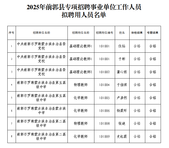 附件:2025年前郭縣專項(xiàng)招聘事業(yè)單位工作人員擬聘用人員名單